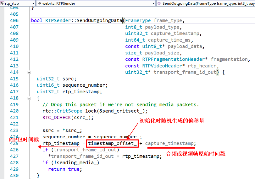 WebRTC 的音频帧的时间戳,从第一个包为 0,开始累加,每一帧增加 = 编码帧长 (ms) x 采样率 / 1000,如果采样率 16KHz,编码帧长 20ms,则每个音频帧的时间戳递增 20 x 16000/1000 = 320。这里只是说的未打包之前的音频帧的时间戳,而封装到 RTP 包里面的时候,会将这个音频帧的时间戳再累加上一个随机偏移量(构造函数里生成),然后作为此 RTP 包的时间戳,发送出去,如下面代码所示,注意,这个逻辑同样适用于视频包。