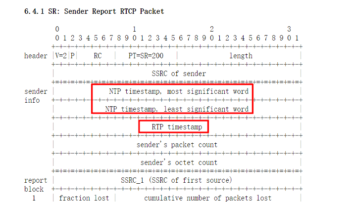 这个时候 RTCP 包里面的一种发送端报告分组 SR(SenderReport) 包就上场了,详情请参考RFC3550。