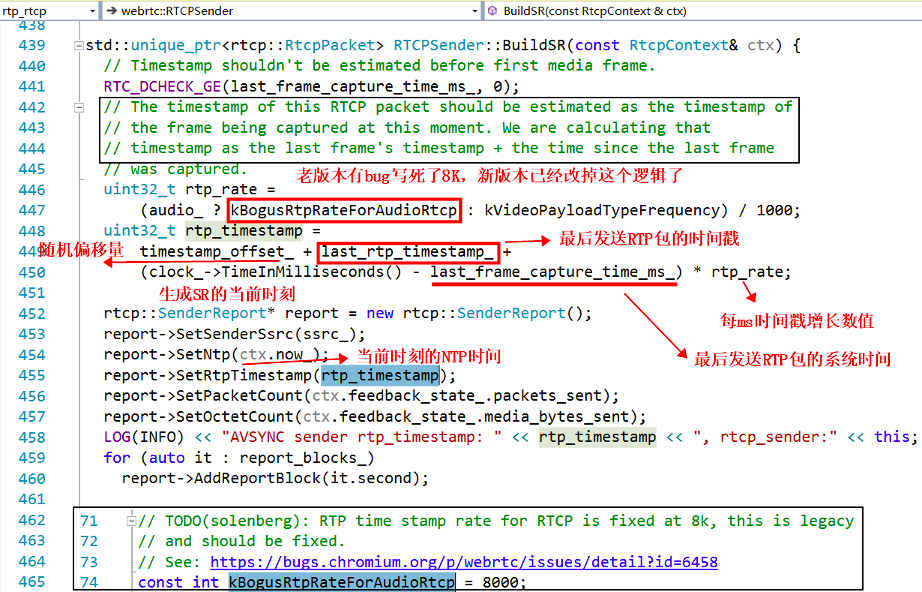 由上面论述可知,NTP 时间和 RTP 时间戳是同一时刻的不同表示,只是精度和单位不一样。NTP 时间是绝对时间,以毫秒为单位,而 RTP 时间戳则和媒体的采样频率有关,是一个单调递增数值。生成 SR 包的过程在 RTCPSender::BuildSR(const RtcpContext &ctx) 函数里面,老版本里面有 bug,写死了采样率为 8K,新版本已经修复,下面截图是老版本的代码: