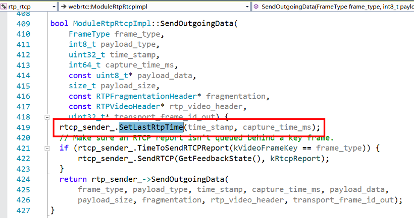 视频数据在编码完之后发往RTP模块构造RTP报文时,视频帧的时间戳timestamp和本地时间capture_time_ms通过RTCPSender::SetLastRtpTime()函数记录到RTCPSender对象的last_rtp_timestamp和last_frame_capture_time_ms参数中,以将来将来构造RTCP SR报文使用。