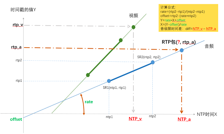 上图以音频的两个 SR 包为例,确定出了 RTP 和 NTP 对应关系的直线,然后给任意一个 rtp_a,就算出了其对应的 NTP_a,同理也可以求任意视频包 rtp_v 对应的 NTP_v 的时间点,两个的差值就是时间差。