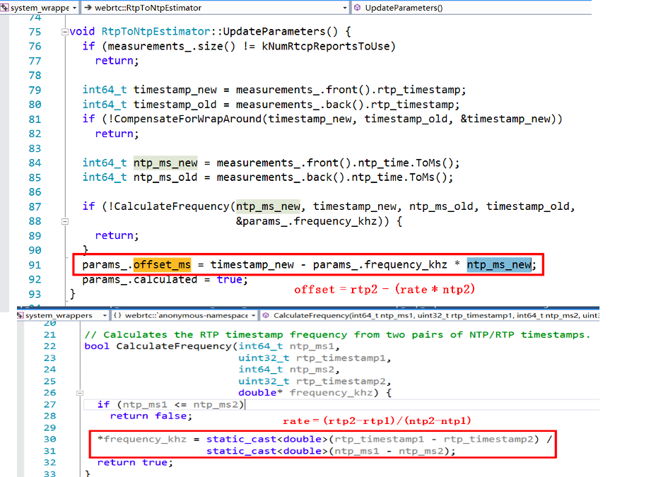 然后,音视频分别以各自的rtp_rtcp和rtp_receiver更新各自的measure。其基本操作包括:从rtp_receiver获取最新接收到的RTP报文的RTP时间戳latest_timestamp和对应的本地接收时刻latest_receive_time_ms,从rtp_rtcp获取最新接收的RTCP SR报文中的NTP时间和RTP时间戳。然后把这些数据都存储到measure中。注意measure中保存最新两对RTCP SR报文中的NTP时间和RTP时间戳,用来在下一步计算媒体流的采样频率。