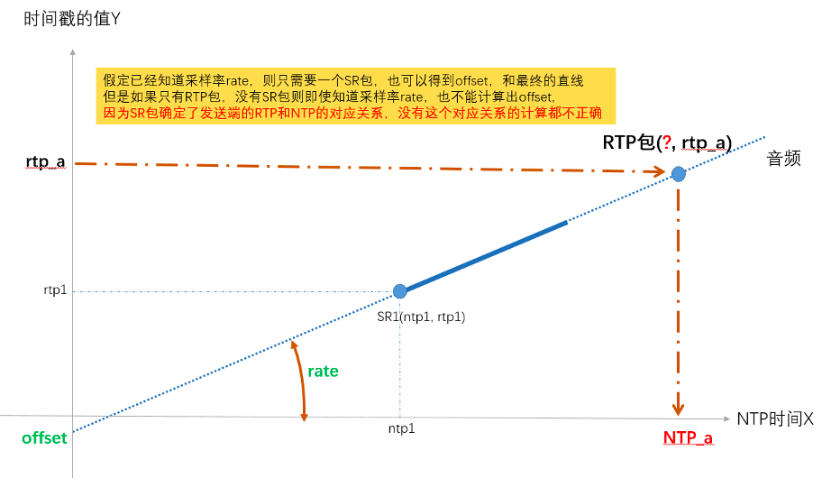通过SR包中的NTP时间戳和RTP时间戳做线性回归(通过采样归纳映射关系)得到两者的线性关系: