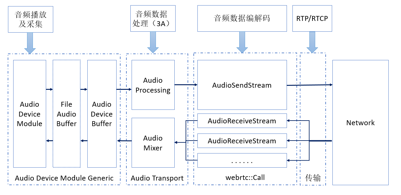 AudioTransport 接 AudioSendStream 和 AudioReceiveStream,在 AudioSendStream 和 AudioReceiveStream 中完成音频的编码发送和接收解码,及网络传输。