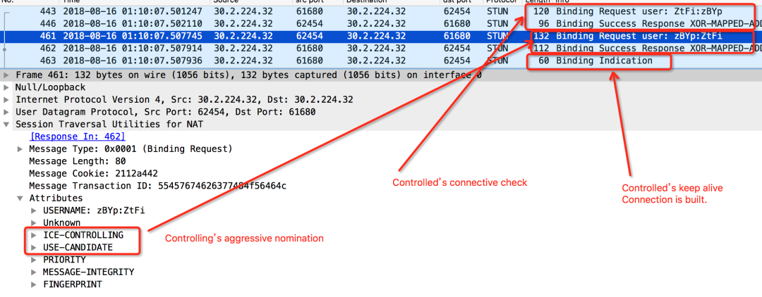 Controlling 模式下的 Agent 发起 Binding Request,并且收到对端的 Response,同时对端发起的 Connective Check 完成,Controling 一端会再次发出一个携带 USE_CANDIDATE标志位的 Binding Request,当Controlled 一端收到了,就接受这次提名。