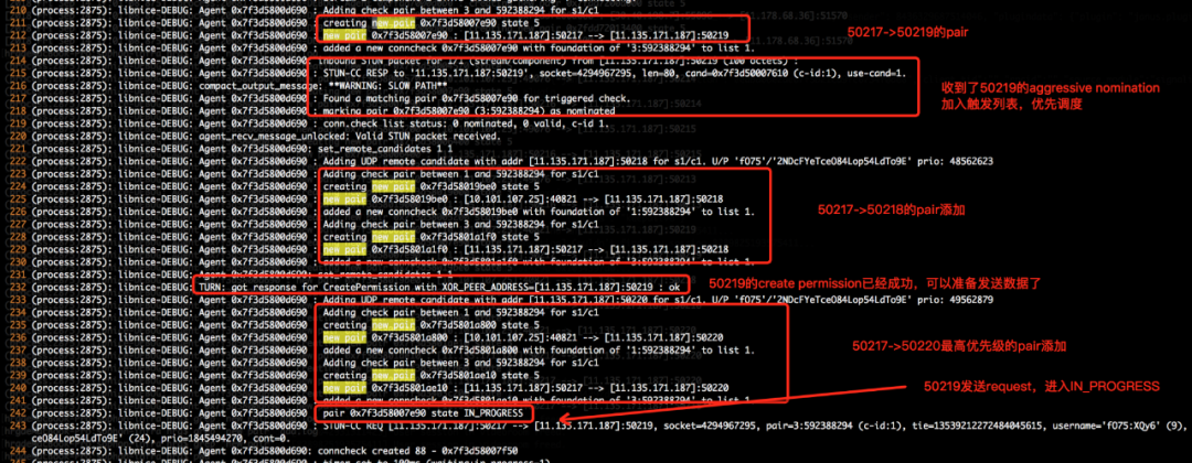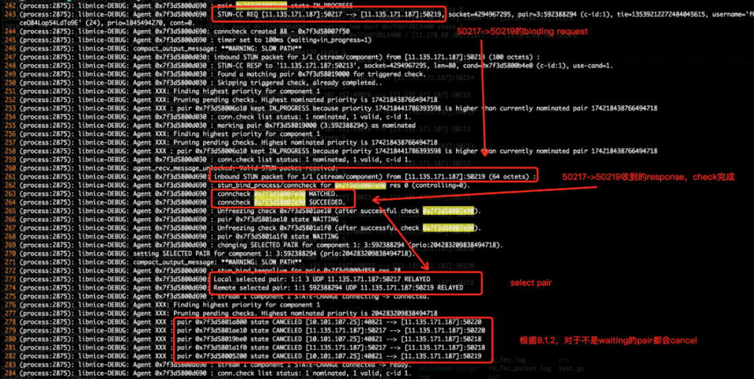 接着在 50219 在其他两个 Create Permission 还没完成时候以迅雷不及掩耳之势完成了 Check,根据 rfc 8.1.2中的描述,对于不是在 In Progress 状态的 Pair,都删除,并不参考其优先级,故最后选择了 50219 这个优先级最低的 Pair。