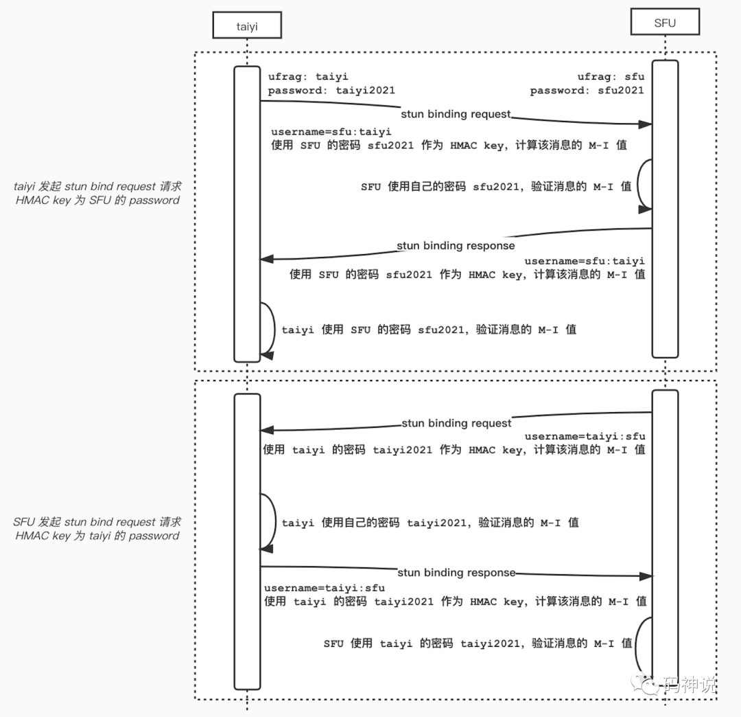SFU 收到来自 taiyi 的 BindingRequest 后,就可以使用自己的 password 计算消息的 M-I 值,以进行消息认证。认证成功后,SFU 回复 BindingResponse 给 taiyi: