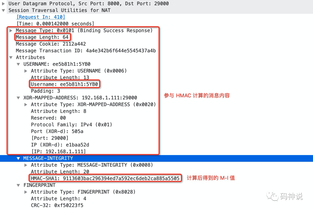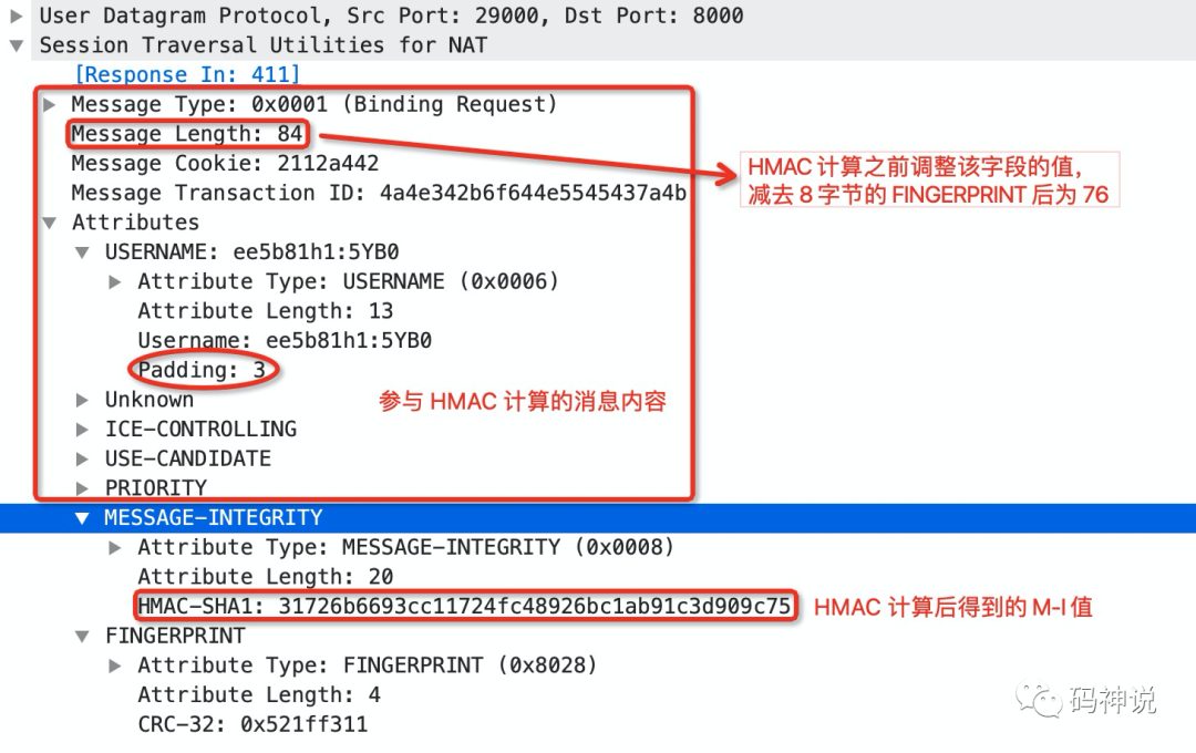 STUN 的 MESSAGE-INTEGRITY 属性包含了对 STUN 消息进行 HMAC-SHA1 计算之后的 HMAC 值,由于使用 SHA-1哈希函数,所以计算出来的 HMAC 值固定为 20 字节。在后面的介绍中,我会使用缩写 M-I 来表示 Message Integrity,并将对 STUN 消息进行 HMAC-SHA1 计算后得到的 HMAC 值称为 M-I 值。