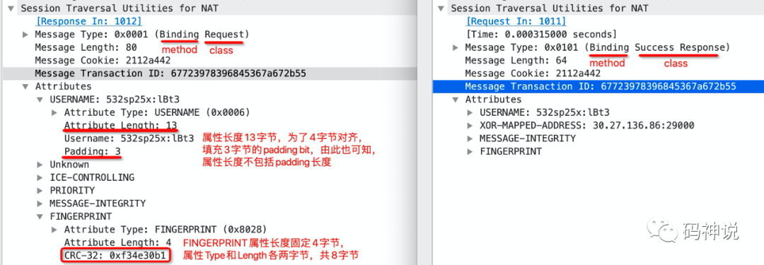 左右两侧分别是在 ICE 场景中的一次 STUN request/response 事务中的 Binding 请求和响应。