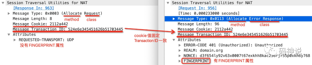 另外,发现左侧的 Allocate request 请求没有携带 FINGERPRINT 属性,而右侧则携带了 FINGERPRINT 属性,这里暂不讨论这种做法是否符合规范,我想要强调的是:FINGERPRINT 机制是 STUN 协议的一种可选机制,并不强制要求携带该属性。不过在标准的 ICE 协议中,STUN 消息都会携带 FINGERPRINT 属性。