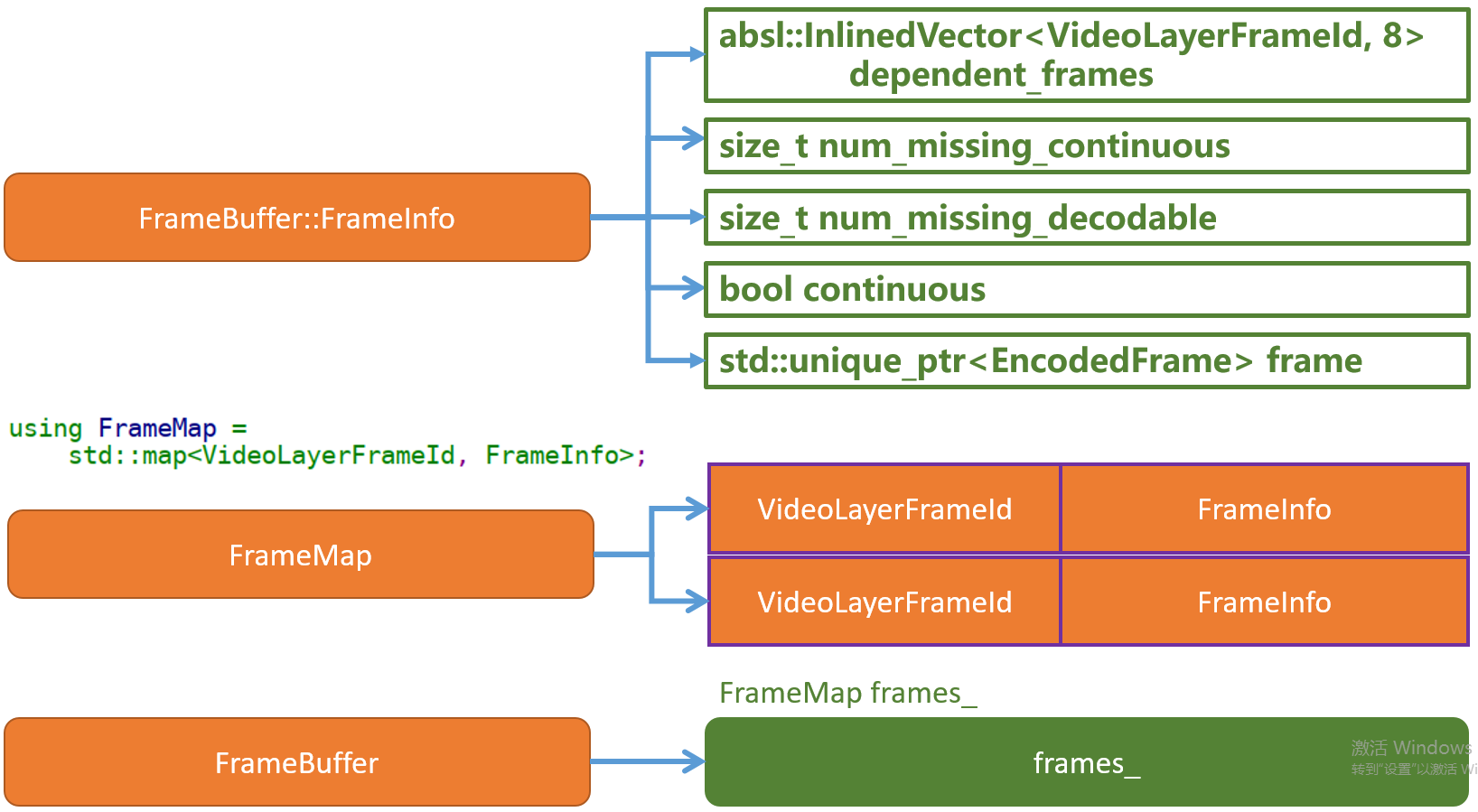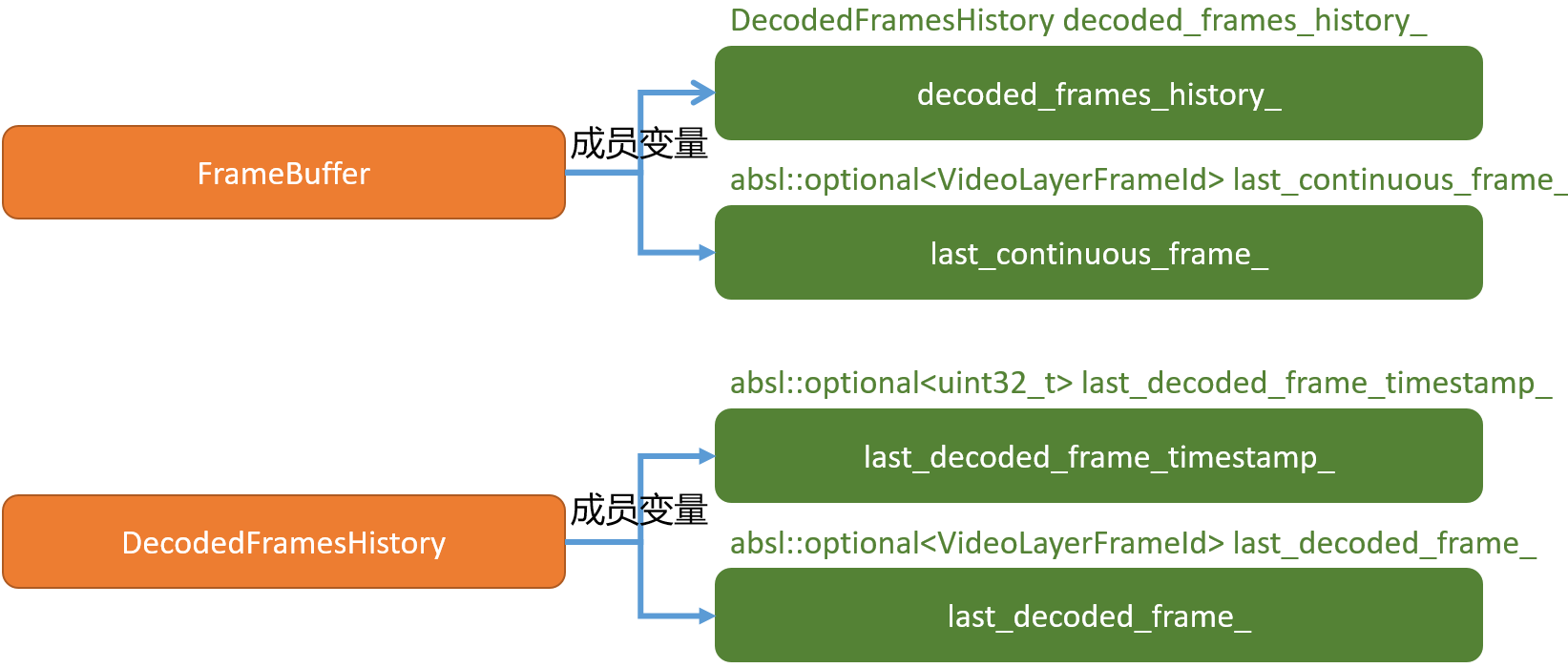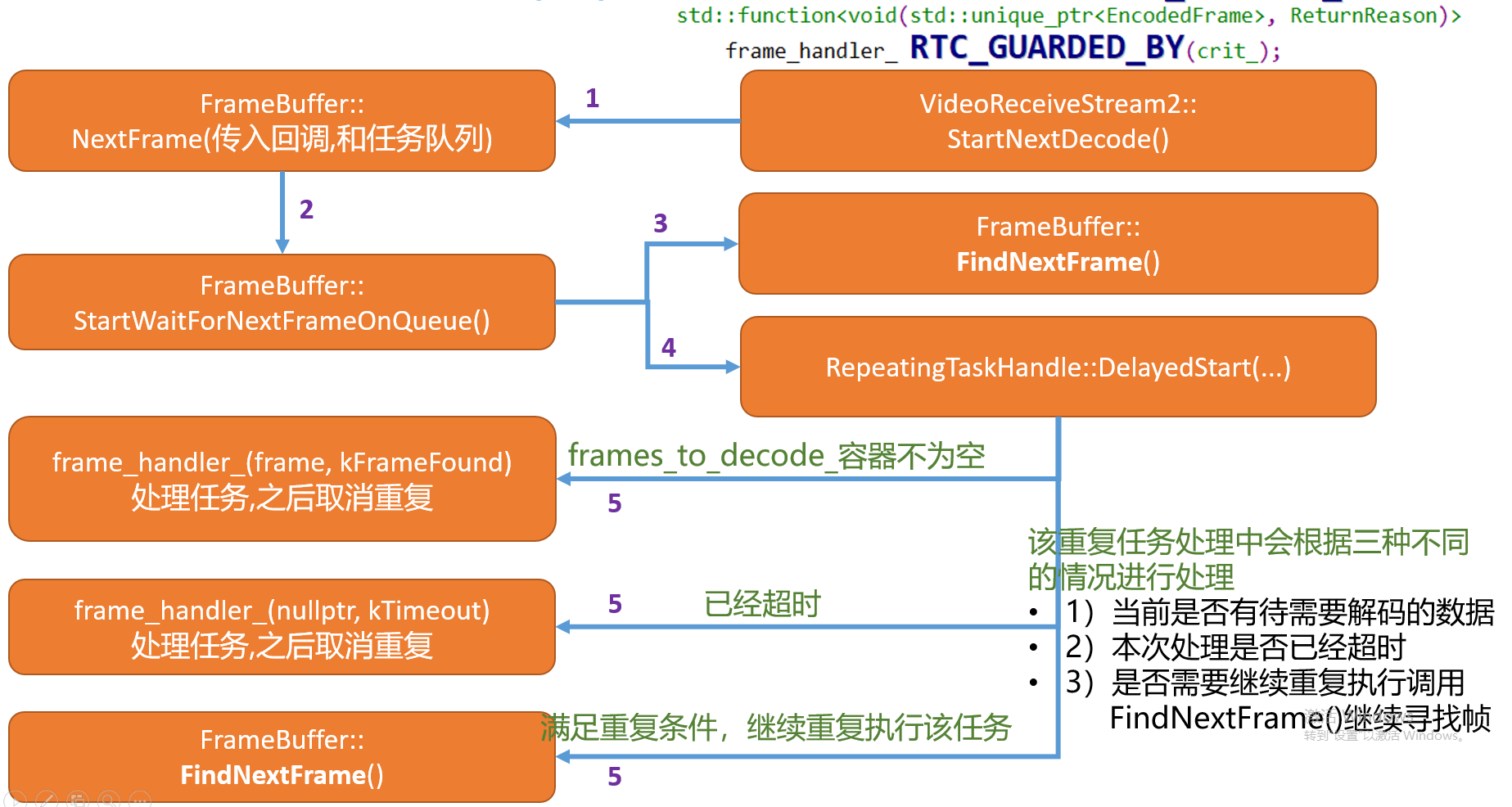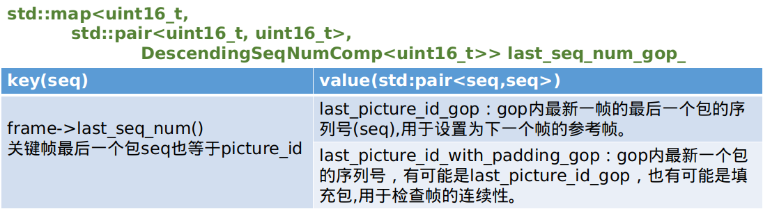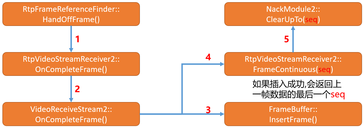 cleared_to_seq_num_变量记录的是已经清除的seq,比如说如果一帧数据已经发送到解码模块,或解码完成,那么需要将对应的seq进行清除,在这里的作用就是判断当前待解码的数据帧的首个包的seq和cleared_to_seq_num_大小进行比较,在未环绕的情况下,如果cleared_to_seq_num_大于frame->first_seq_num()则说明该帧数据之前的帧已经解码了,此帧应该放弃解码,所以直接返回。cleared_to_seq_num_变量的更新通过调用ClearTo(uint16_t seq_num)函数来更新,调用流程后续会分析到。- 调用