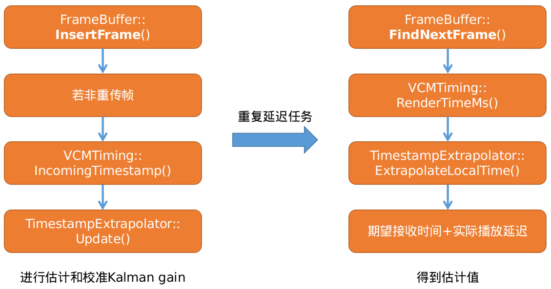 VCMJitterEstimator模块所得出的jitterDelay它的核心作用是给到vcmTiming模块用于估计期望渲染时间,为什么要这么做? - 在实际的传输过程中若完全不做处理,那么实际的帧间延迟就如上图右下方蓝色曲线所示,如果来一帧数据就送到解码器让解码器做解码并渲染,那么在数据量变化剧烈或突然出现网络波动等一系列导致帧间延迟瞬时变化较大的时候可能会出现卡顿的问题,并且视觉上也会有明显的表象