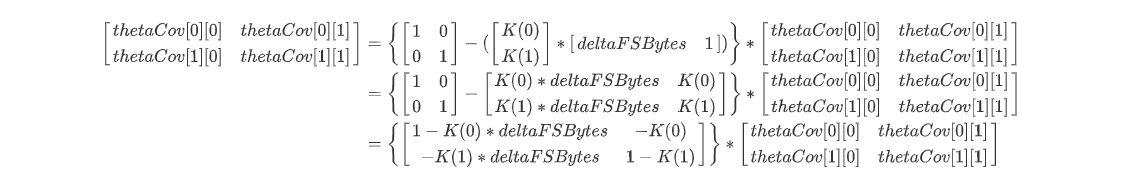 _thetaCov[0][0] = (1 - kalmanGain[0] * deltaFSBytes) * t00 -