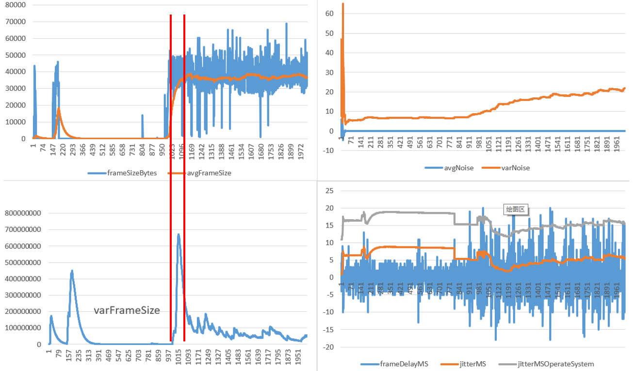 - 以上一共近2000帧数据,从上图来看,在937帧数据左右,画面从静止编程动画,数据量瞬间增大,此时,平均帧大小的方差也随之增大,从图像右边的测量噪声的方差曲线来看,也发现测量噪声的方差随之增大