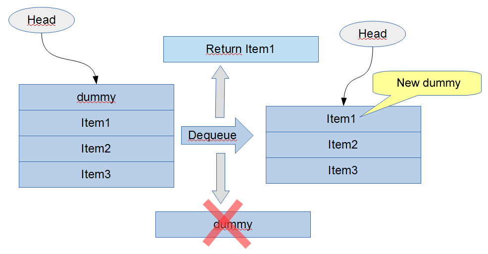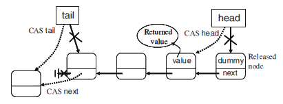 他们注意到Michael和Scott的算法中,出队运算仅需要一个CAS,而入队需要两个CAS,如上图所示。