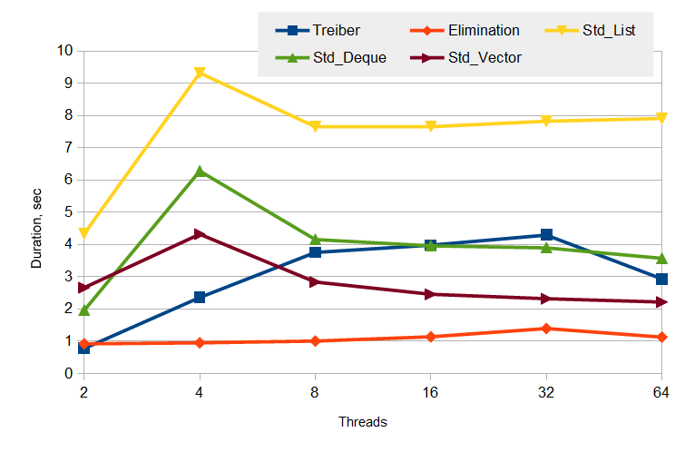 生产者和消费者测试:一些线程会写入栈中即压栈,而另一些线程会读取栈即弹栈。一组相同数量的生产者和消费者,生产者和消费者的线程总数都是百万级。标准的栈,其同步由互斥量完成。
