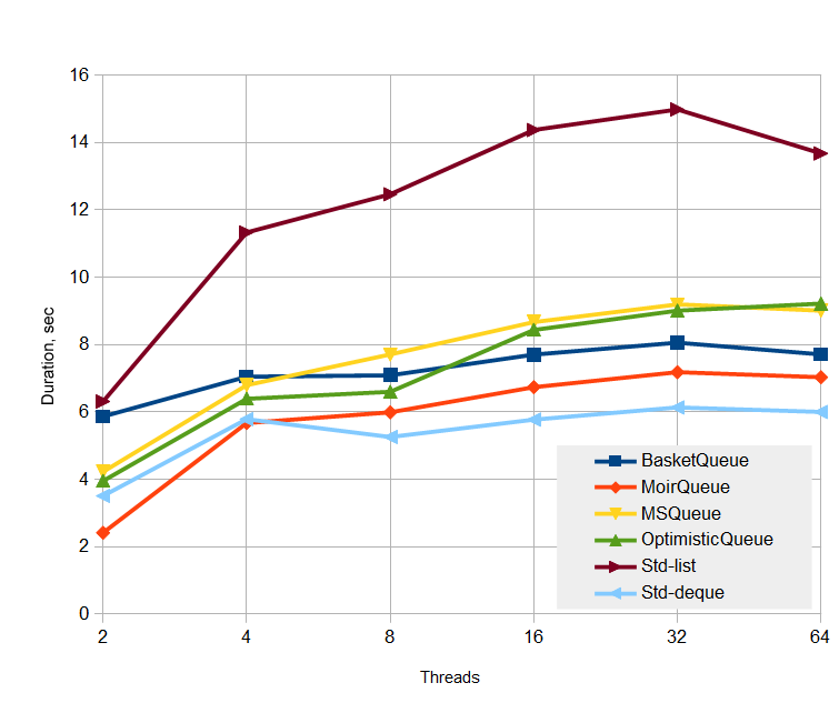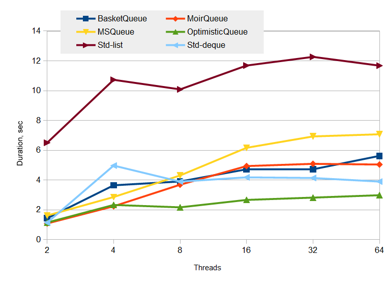 这个测试相当切合实际,队列中包含N个生产者,N个消费者,分别执行百万条写运算,百万条读运算。图表中的线程数,为生产者和消费者的线程数之和。