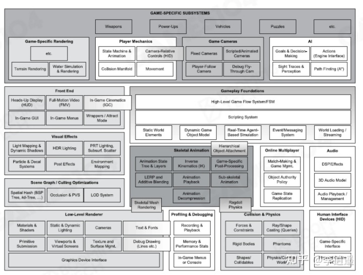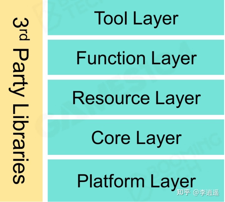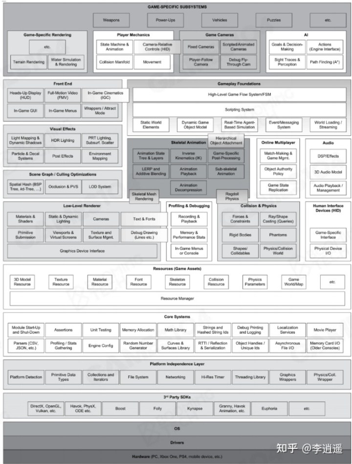 确实看这张框架图就要劝退一大波人啊,又是操作系统又是硬件设计还有渲染、物理碰撞、动画仿真等等。其实大可不必去细细了解所有details,先有一个宏观的逻辑架构然后当你需要研究那块时再去细细专研。和所有的大型软件设计一样,游戏引擎也是采用了分层架构,可以大致分为:Platform Layer、Core Layer、Resource Layer、Function Layer 、Tool Layer[3]