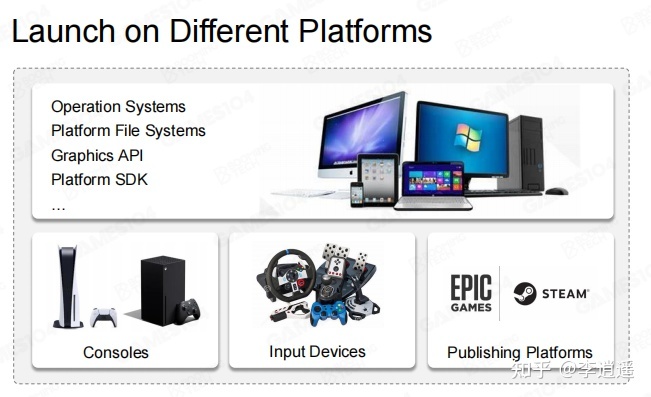游戏引擎通常需要运行在不同的平台上从而覆盖最大的市场,不同的平台又有不同的Operation Systems、Platform File Systerms 、Graphics API(引用程序接口 -application programming interface,API)、Plateform SDK(第三方软件开发包- software development kit,SDK)。
