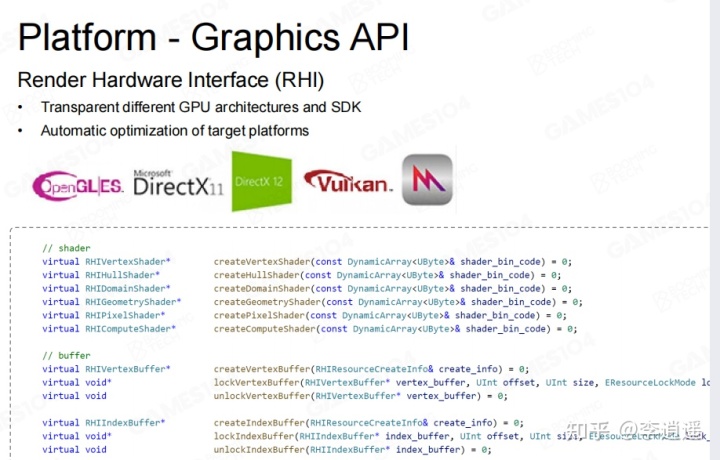 平台层(Platform Layer)的本质就是你在引擎上写核心代码时可以无视平台的区别(Windows、Linux、macOS等等),把平台的差异性掩盖这是现代游戏引擎非常核心的功能。如果没有这一层平台层,我们做一款跨平台游戏的时候就会很崩溃,比如你会遇到很多不一样的Graphics API如DirectX12、Monterey、OpenGL、Vulkan等等。所以在现代游戏引擎平台层中有一个硬件渲染接口RHI(Render Hardware Interface),他重新定义一层图形API把各个硬件的SDK区别把它封装起来。RHI 是图形 API 和渲染器之间的抽象层。它允许渲染器完全独立于 API[4]。