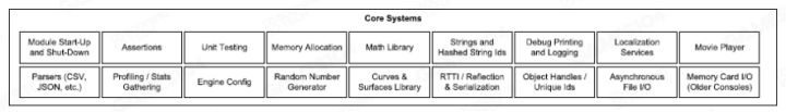 Core Layer是什么意思呢? 可以简单的理解为像游戏引擎这种大型软件系统,都需要核心层提供一些有效的功能使用程序(utility),它们需要满足超高的性能设计以及高标准的编码。如下图所示一些常见的功能如:自定义的数据结构与算法、内存分配、数学库等等。