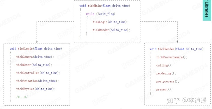 就如我们在游戏引擎架构-Function layer所讲的,游戏引擎有一个简单的大逻辑那就是Drive into Ticks,现代游戏引擎每执行一次Tick的时候系统就会把所有该做的事情做完,可以简单的分为Ticklogic( )和Tickrender( )。