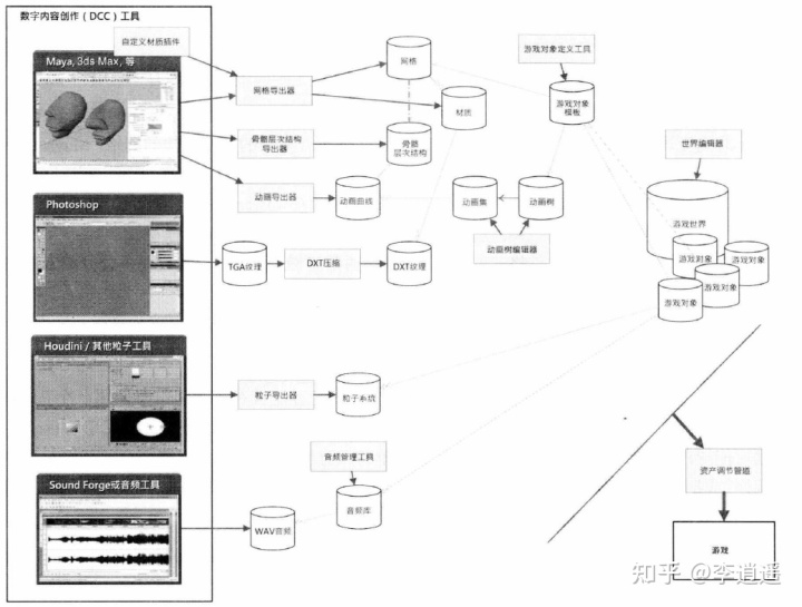 游戏引擎的输入数据形式形式广泛,列如三维骨骼、纹理贴图、动画数据、音频文件等,这些数据源基本都由美术人员由数字内容创作(Digital Content Creation,DCC)软件制作。比如Autodesk公司的Maya和3ds Max通常用来制作三维网格数据及动画数据,Adobe公司的PS及其家族成员用于创作纹理,Sound Forge是制作音频的流行工具。