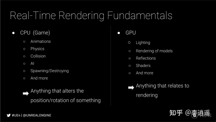 从上图Real-Time Rendering Fundamentals中可以看出,虚幻引擎的大逻辑也可以分为CPU处理的逻辑运算以及GPU负责的渲染计算,两者并行(可以用stat engine、stat scenerendering命令查看)。