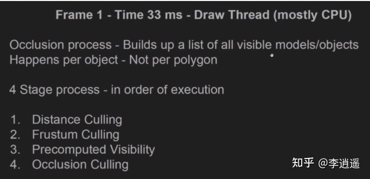然后CPU和部分GPU会计算遮挡过程,剔除所有不可见对象,将所有可见对象记录在一个列表中。剔除方法包括 距离剔除、视锥剔除、预计算可视性、遮挡剔除 。