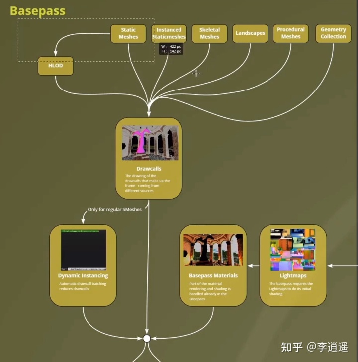 BasePass最重要的基础通道,也是最大的渲染步骤之一[7]。基本通道是指它穿过的初始渲染通道,它的作用是渲染几何体的所有部分(Meshes和Materials)。首先它会确定所有的3D对象如(Static Meshes、HLOD等),所有的这些对象都会成为一个个的绘制调用Drawcall。