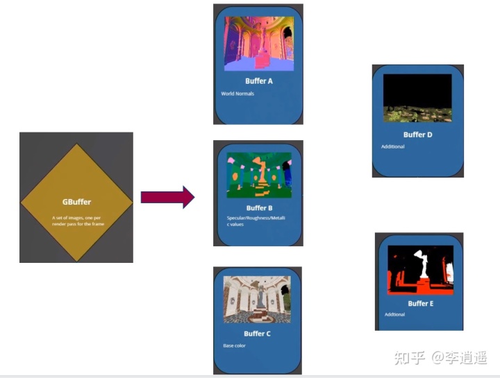 从G-Buffer(Geometry Buffer)开始,引擎不在依靠计算机计算的结果,而是利用存储在图片中的信息进行后续的处理(这里可以解释为什么延迟渲染技术可以解决大量光照的渲染消耗问题,我们可以先得到G-Buffer再去做光照计算,由于屏幕上的像素只有这么多如1024920,只需要把这些点进行光照迭代就行了。延迟渲染的本质是先不要去做三角形迭代和光照计算,而是先找到你能看到的所有像素再去做光照计算。直接迭代三角形的话,很多三角形是看不到的,无疑是巨大的浪费*)。G-Buffer可以存储各种的通道:如世界空间法向量(World Normals)、高光度、粗糙度、金属度、漫反射等等。