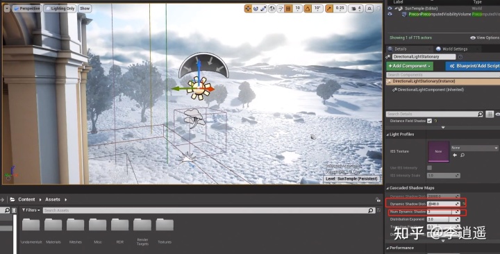 但如果可以用某种方法能够存储模型之间的距离信息,就可以花费更少的时间来实时计算这些所有的数据,而距离场阴影(Distance Shadow Maps)就是UE4中加速该过程的方法之一。使用距离场信息而非几何体信息实现超远距离的阴影,不是很精确但是消耗很低。但也是目前实用的方法,通过创建体积纹理(Volume Texture)用于阴影计算,纹理的分辨率决定了阴影的细节程度。通常情况下分辨率很低。仅能用来实现远距离的阴影。
