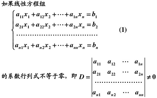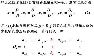 定理4 如果线性方程组(1)的系数行列式不等于零,则该线性方程组一定有解,而且解是唯一的 .