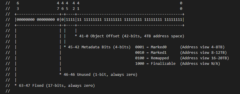 与上述地址空间划分相对应,ZGC实际仅使用64位地址空间的第0~41位,而第42~45位存储元数据,第47~63位固定为0。