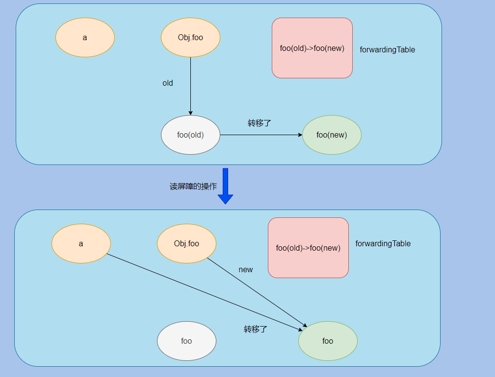 下图展示了读屏障的效果,其实就是转移的时候找地方记一下即 forwardingTable,然后读的时候触发引用的修正。