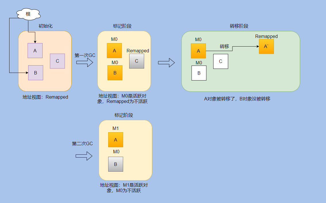 - 并发标记阶段:第一次进入标记阶段时视图为M0,如果对象被GC标记线程或者应用线程访问过,那么就将对象的地址视图从Remapped调整为M0。所以,在标记阶段结束之后,对象的地址要么是M0视图,要么是Remapped。如果对象的地址是M0视图,那么说明对象是活跃的;如果对象的地址是Remapped视图,说明对象是不活跃的。
