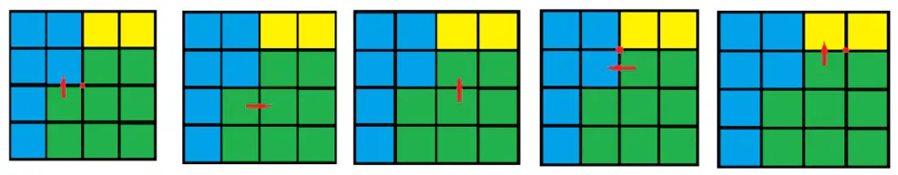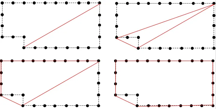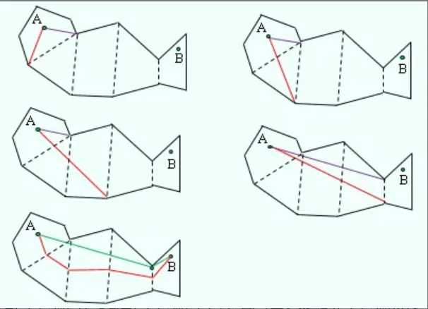 增加新的漏斗顶点:如果移动端点后的边是朝向漏斗收缩的方向,但会跨过另外1条边。此时将另外1个端点加入路径,并将其更新为新漏斗的顶点。