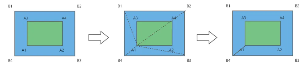 根据起点初始化漏斗端口。起点A不仅作为漏斗的初始顶点,也作为漏斗的初始两个端口,此后两个端口不停地向公共边的两个端点移动。