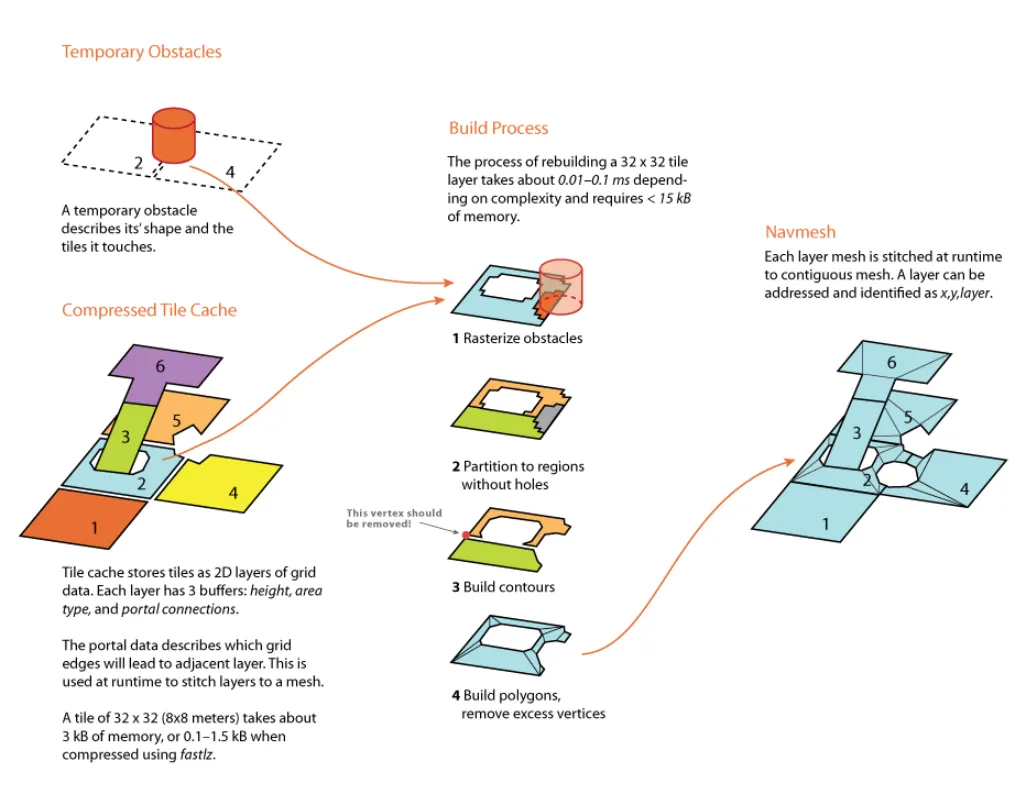 动态阻挡会存储压缩的高度域信息(光栅化和创建高度域占据的时间占据大头,所以会存储此部分压缩数据)到tile cache,在运行时如果有进行动态障碍的更改,通过对tile设定的触发器,重新进行构建操作。