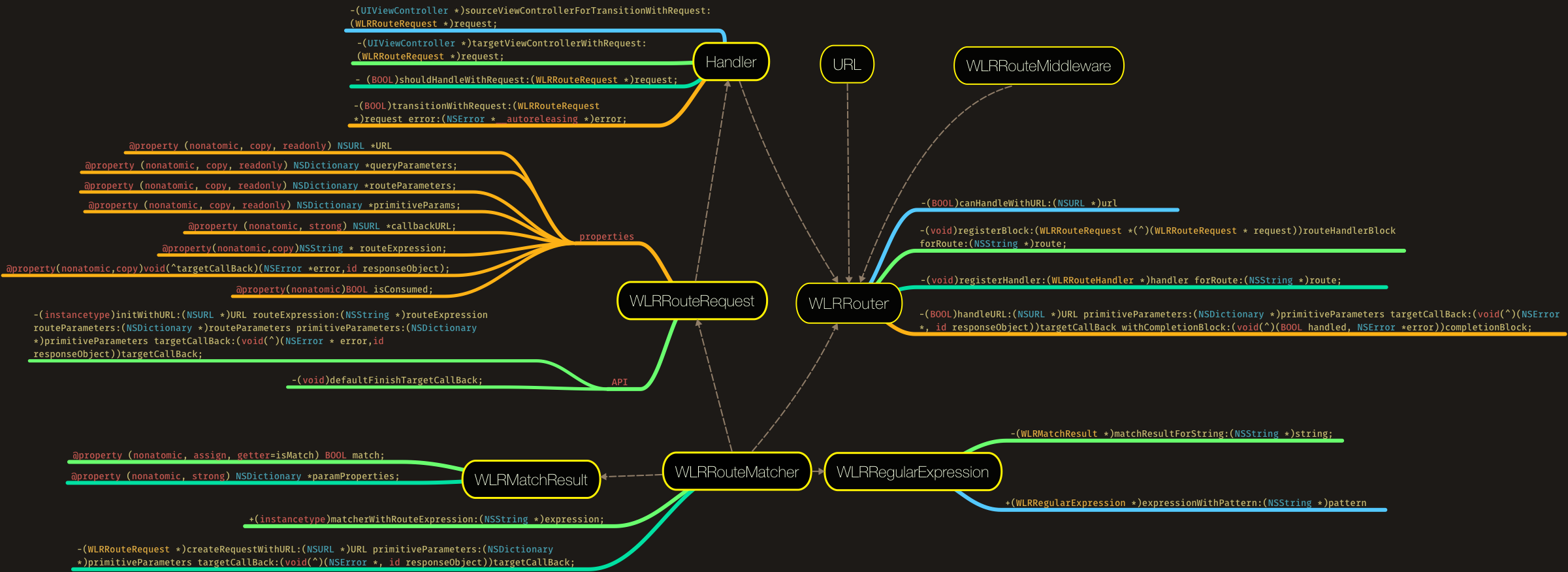 - WLRRouter,路由核心对象,内部持有注册的Handler,比方说负责界面跳转的Handler,负责组件加载的Handler,负责API的Handler等等,路由的作用就是将外部调用传入的URL或者是内部调用传入的target,在内部匹配上对应的handler,然后调用生命周期方法,完成处理过程,当然,图中还有route的中间件,实际上是预留AOP的口子,方面后期扩展