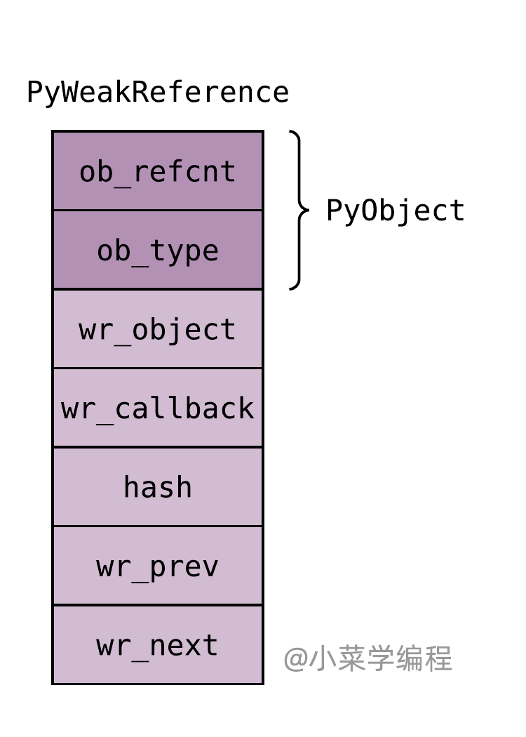 由此可见,PyWeakReference 结构体便是弱引用对象的肉身。它是一个定长对象,除固定头部外还有 5 个字段: