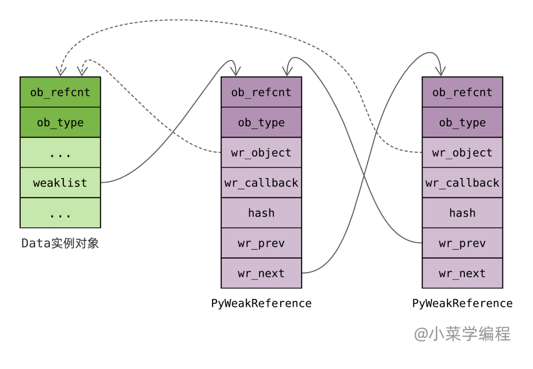 wr_object,对象指针,指向被引用对象,弱引用根据该字段可以找到被引用对象,但不会产生引用;wr_callback,指向一个可调用对象,当被引用的对象销毁时将被调用;hash,缓存被引用对象的哈希值;wr_prev和wr_next分别是前后向指针,用于将弱引用对象组织成双向链表;