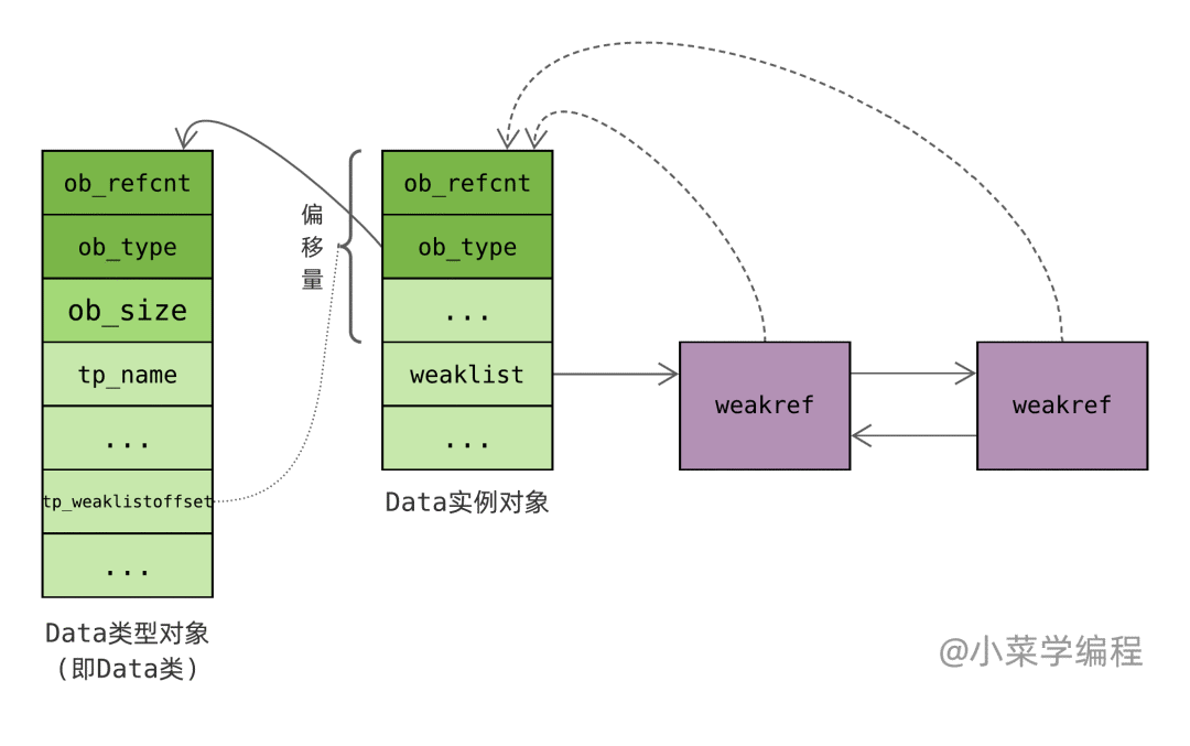 前面我们提到,对同一对象的所有弱引用,被组织成一个双向链表,链表头保存在对象中。由于能够创建弱引用的对象类型是多种多样的,很难由一个固定的结构体来表示。因此,Python 在类型对象中提供一个字段 tp_weaklistoffset ,记录弱引用链表头指针在实例对象中的偏移量。
