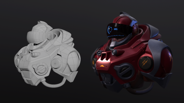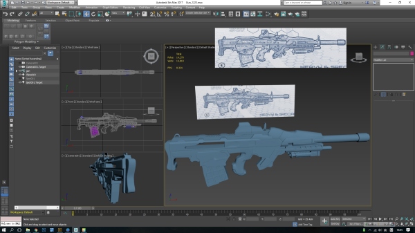 当我们的 Character Design 工作完成以后,会得到准确的角色、道具设定,但是那些资源都无法在我们的游戏里使用(我们不讨论 2D 游戏)。真正的游戏资源制作,是从建模开始。首先,为重要物体建模,需要用到前面制作的三视图,来锚定外形和结构,设计师是这么用的: