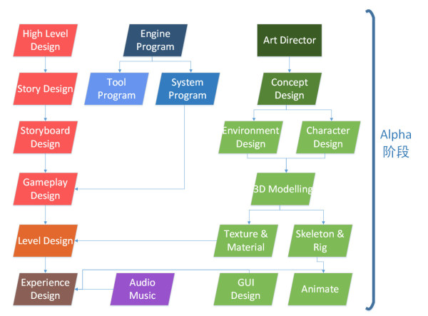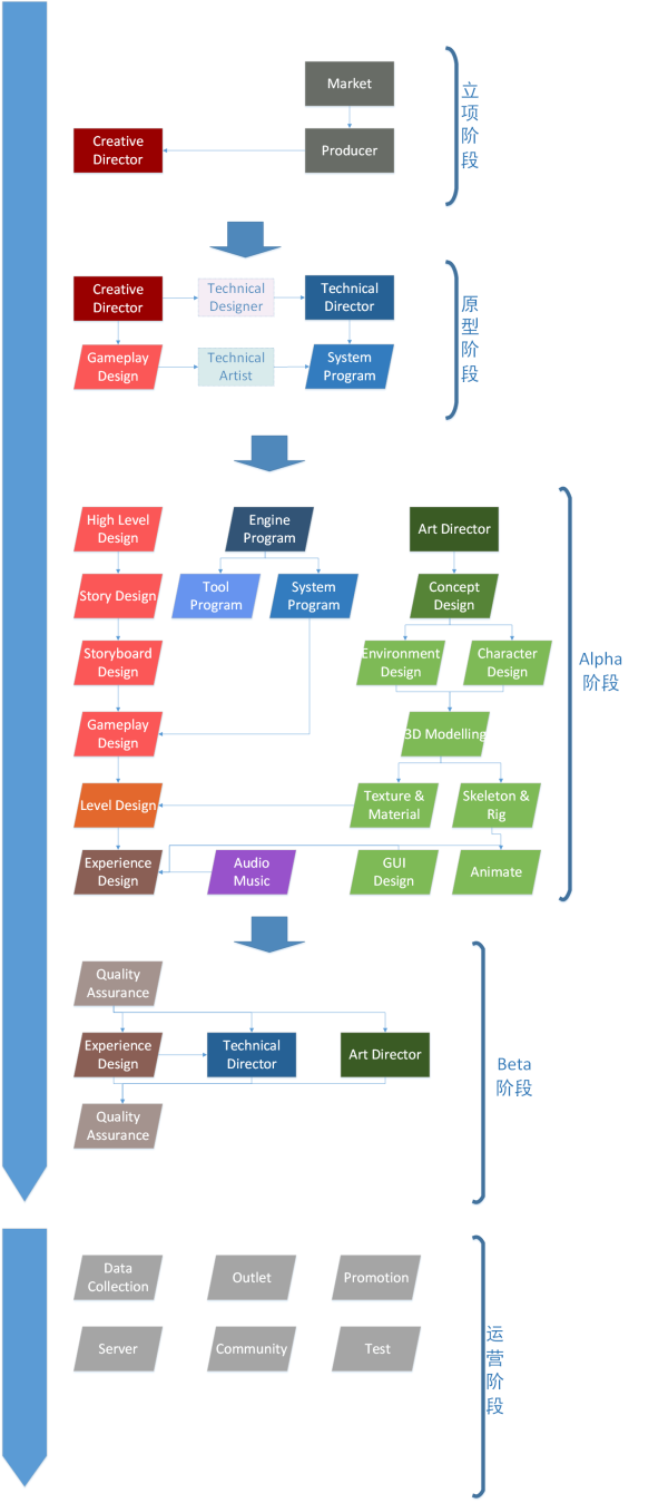 在人员配置图中还有很多其他的角色,我将在游戏开发流程中逐个说明他们的作用。现在建议大家把 人员配置图 打开放在屏幕的一边,然后把下面这张 开发流程图 打开放在另一边,下图: