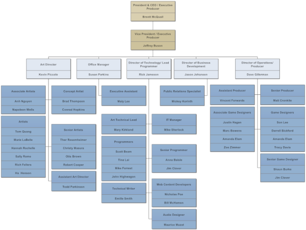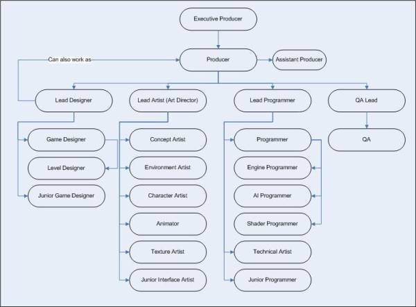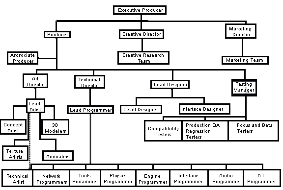 首先一个标配游戏团队中有三大 Director:Creative Director(创意总监)、Technical Director(技术总监)、Art Director(艺术总监)。说土鳖点就是:主策、主程、主美。很多新人以为 Creative Director(主策划)就是游戏团队中最大的 BOSS,可以拍板说话。但其实三大 Director 上面还有 Producer,在公司里 Producer 上面还有 CEO,CEO 上面还有 Board of Directors。