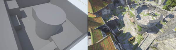 左图是艾兴瓦尔德的关卡设计示意图,右图是完成场景搭建后的效果。完成场景搭建后,我们的游戏基本就拥有了华丽的外表。还记得原型阶段给大家展示的截图吗,来看一下它们对应 Alpha 阶段的截图对比: