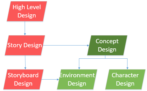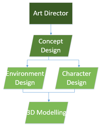 在 High Level Design 进到中后期,Art Director 会进入到世界架构师的团队,他会搞清楚那些人的脑子现在都装了些什么。然后会用速涂的方式,来尝试着用画面表现那些人想出来的世界,并与他们确认。随后,Art Director 就会开始初次设定游戏世界的画面风格,制定绘画规范。