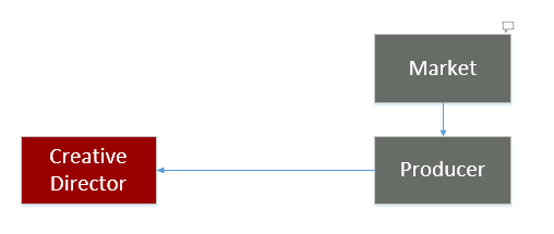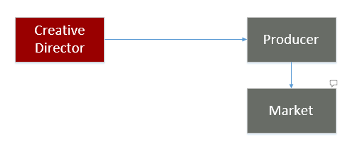 比如说:经市场部研究分析,今年三国题材的游戏,不论游戏玩法类型如何,都比相同类型的游戏拥有更多的下载量,预测明年三国题材将会保持这项优势;今年传统 TOP-DOWN 类型的 MOBA 游戏,总活跃玩家数比去年有轻微下降,但是 FPS 和 TPS 类型的 MOBA 游戏有明显的增量,预测后面几年 MOBA 游戏市场大流将会从细分类型 TOP-DOWN 转向 FPS。公司里正闲着想做下一个项目的制作人老李拿到这些数据:"噢!那我们就来做一个三国题材的FPS+MOBA 游戏吧!稳赚不赔,就这么定了!" 然后老李就找到御用主策老王:"你看我们之前那个项目能不能换个皮变成一个三国题材的 FPS+MOBA游戏,或者说你重新设计一个?" 这是 Market->Producer->Creative Director 模式。