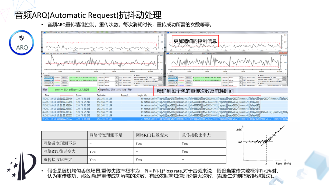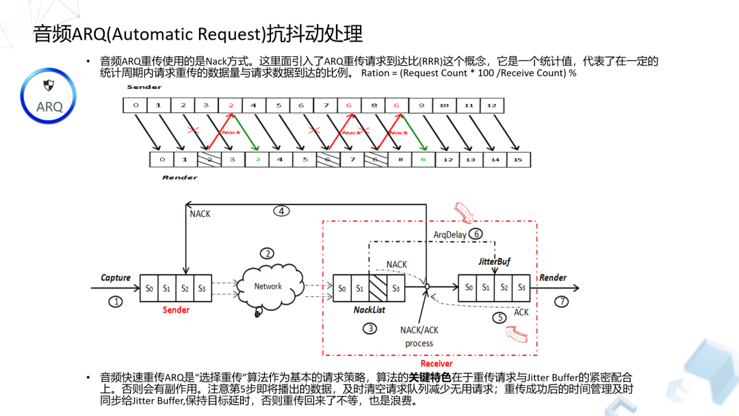 如果这块做不好的话,实际上会有副作用,宁可不要这功能。在QQ时代,一个典型例子是应用层有个逻辑,在基于RTT小于多少毫秒的基础情况下,给音频数据包进行重传,主观上认为只要是把丢包重新传回来,这个效果肯定是好的,至于底层的TRAE音频引擎怎么处理,实际上不太关心。但这个是不够的,这就是今天讲的红箭头5和6比较细节的地方,重传算法主要关注的是对于缺失的数据包重传间隔以及最大重传次数,但是数据包重传回来的时候,这个包怎么合理利用它。同时,播放器则是按照时间轴不停播放的,数据没有来,是否还不停地要呢?这块有一个正反馈和负反馈的过程。